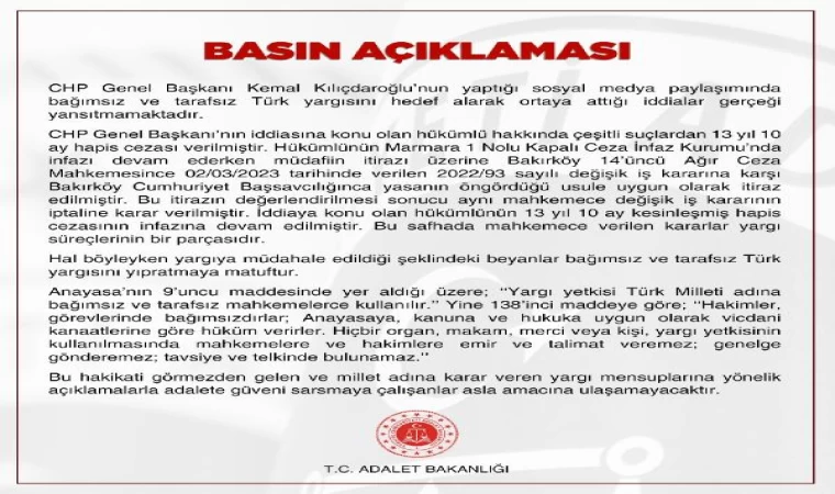 Bakanlıktan yapılan yazılı açıklamada, "CHP Genel Başkanı Kemal Kılıçdaroğlu'nun yaptığı sosyal medya paylaşımında bağımsız ve tarafsız Türk yargısını hedef alarak ortaya attığı iddialar gerçeği yansıtmamaktadır. CHP Genel Başkanı'nın iddiasına konu olan hükümlü hakkında çeşitli suçlardan 13 yıl 10 ay hapis cezası verilmiştir. Hükümlünün Marmara 1 No’lu Kapalı Ceza İnfaz Kurumu'nda infazı devam ederken müdafinin itirazı üzerine Bakırköy 14'üncü Ağır Ceza Mahkemesi'nce 2 Mart 2023 tarihinde verilen 2022/93 sayılı değişik iş kararına karşı Bakırköy Cumhuriyet Başsavcılığı'nca yasanın öngördüğü usule uygun olarak itiraz edilmiştir. Bu itirazın değerlendirilmesi sonucu aynı mahkemece değişik iş kararının iptaline karar verilmiştir. İddiaya konu olan hükümlünün 13 yıl 10 ay kesinleşmiş hapis cezasının infazına devam edilmiştir. Bu safhada mahkemece verilen kararlar yargı süreçlerinin bir parçasıdır" denildi.
