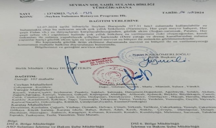 Seyhan Sol Sahil Sulama Birliği tarafından Yüreğir, Ceyhan, Sarıçam ve Karataş ilçelerindeki mahalle muhtarlarına gönderilen resmi yazıda şu ifadelere yer verildi: