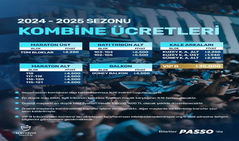 Mavi-lacivertli ekipten yapılan açıklamada, “ Büyük Adana Demirspor taraftarı, maç biletlerine oranla çok daha avantajlı olan kombine biletlerinizi almak ve takımınıza destek olmak için söz sizde! Kombine satışlarımıza gelen yoğun talep doğrultusunda 15 Temmuz saat 23.59’a kadar kombine satışımız devam edecek. 16 Temmuz-31 Temmuz arasında kombinelerimiz %20 zamlı şekilde satışta olacaktır” denildi.