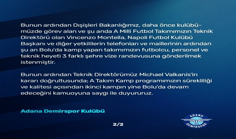 "İtalya Konsolosluğu tüm gerekli evraklarımızı hazırlamamıza, kamp organizatörlerinden ve Napoli ile Bari takımlarından gelen davet yazılarına rağmen vize müzakerelerini geç başlatmıştır. Bunun ardından Dışişleri Bakanlığımız, daha önce kulübümüzde görev alan ve şu anda A Milli Futbol Takımımızın teknik direktörü olan Vincenzo Montella, Napoli Futbol Kulübü Başkanı ve diğer yetkililerin telefonları ve maillerinin ardından şu an Bolu’da kamp yapan takımımızın futbolcu, personel ve teknik heyeti 3 farklı şehre vize randevusuna gönderilmek istenmiştir. Bunun ardından teknik direktörümüz Michael Valkanis’in kararı doğrultusunda, A takım kamp programımızın sürekliliği ve kalitesi açısından ikinci kampın yine Bolu’da devam edeceğini kamuoyuna saygıyla duyururuz."