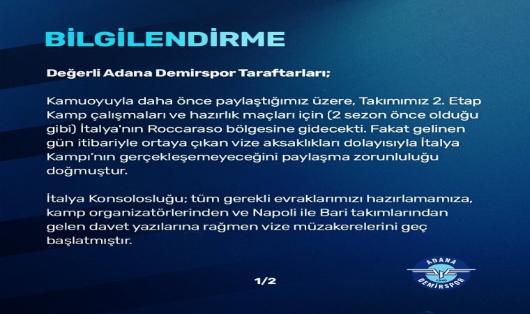 Trendyol Süper Lig ekiplerinden Adana Demirspor’un İtalya’da düzenleyeceği hazırlık kampı ’vize’ engeline takıldı. İtalya Konsolosluğu’na tepki gösteren kulüp, kampı Bolu’da yapacaklarını duyurdu.