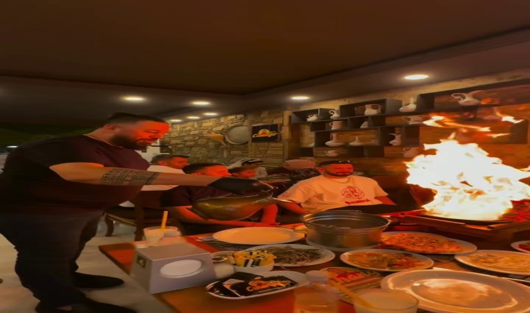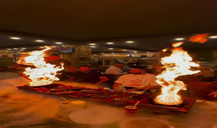 Adanalı kebapçı Cihangir Korkmaz, masada ateşli sunumuyla geleneksel Adana kebabı modern tarzda sunuyor.