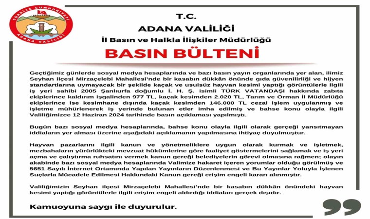 Valilikten yapılan açıklamada, "Geçtiğimiz günlerde sosyal medya hesaplarında ve bazı basın yayın organlarında yer alan, ilimiz Seyhan ilçesi Mirzaçelebi Mahallesi’nde bir kasabın dükkân önünde gıda güvenilirliği ve hijyen standartlarına uymayacak bir şekilde kaçak ve usulsüz hayvan kesimi yaptığı görüntülerle ilgili iş yeri sahibi 2005 Şanlıurfa doğumlu İ. H. Ş. isimli kişi hakkında zabıta ekiplerince kaldırım işgalinden 977 TL, kaçak kesimden 2 bin 20 TL, Tarım ve Orman İl Müdürlüğü ekiplerince ise kesimhane dışında kaçak kesimden 146 bin TL cezai işlem uygulanmış ve işletme mühürlenerek iş yerinde bulunan etler imha edilmiş ve bahse konu olayla ilgili Valiliğimizce 12 Haziran 2024 tarihinde basın açıklaması yapılmıştı. Hayvan pazarlarını ilgili kanun ve yönetmeliklere uygun olarak kurmak ve işletmek, mezbahaların yürürlükteki mevzuat hükümlerine göre faaliyet göstermelerini sağlamak ve iş yeri açma ve çalıştırma ruhsatını vermek kanun gereği belediyelerin görevi olmasına rağmen, olayın akabinde bazı sosyal medya hesaplarında valimize hakaret içeren yorumlar olduğu görülmüş ve 5651 Sayılı İnternet Ortamında Yapılan Yayınların Düzenlenmesi ve Bu Yayınlar Yoluyla İşlenen Suçlarla Mücadele Edilmesi Hakkındaki Kanun gereği erişim engeli kararı alınmıştır. Valiliğimizin Seyhan ilçesi Mirzaçelebi Mahallesi’nde bir kasabın dükkân önündeki hayvan kesimi yaptığı görüntülerle ilgili erişim engeli aldırdığı iddiaları gerçek dışıdır" ifadeleri yer aldı.