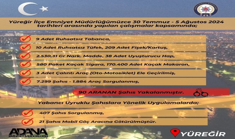 Adana Emniyet Müdürlüğü, Yüreğir İlçe Emniyet Müdürlüğü ekiplerince yapılan asayiş uygulamalarında 9 ruhsatsız tabanca, 10 ruhsatsız tüfek, 209 fişek ele geçirildi. Aynı zamanda uyuşturucu ve kaçakçılık ile mücadele çerçevesinde 2 bin 530 gram uyuşturucu, 38 uyuşturucu hap, 170 bin 400 kaçak makaron, 580 paket kaçak sigara ele geçirildi. Asayiş ve trafik denetlemelerinde ise 3 çalıntı araç ele geçirilirken 7 bin 299 şahıs ve bin 885 araç sorgulandı. Yabancı uyruklu şahıslara yönelik uygulamalarda 407 kişiden 21’i evrakı olmadığı için mobil göç aracına götürülerek sorguları yapıldı. Öte yandan yapılan sorgulamalarda ise çeşitli suçlardan aranan 90 şahıs yakalandı.