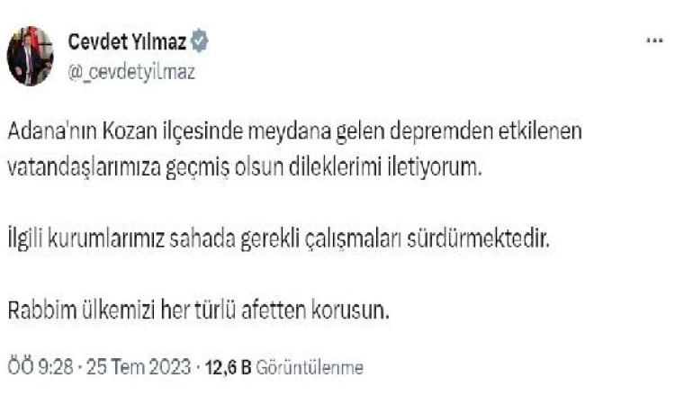 Cumhurbaşkanı Yardımcısı Cevdet Yılmaz da, sosyal medya hesabından yaptığı açıklamada, "Adana'nın Kozan ilçesinde meydana gelen depremden etkilenen vatandaşlarımıza geçmiş olsun dileklerimi iletiyorum. İlgili kurumlarımız sahada gerekli çalışmaları sürdürmektedir. Rabbim ülkemizi her türlü afetten korusun'' ifadelerini kullandı. (DHA)