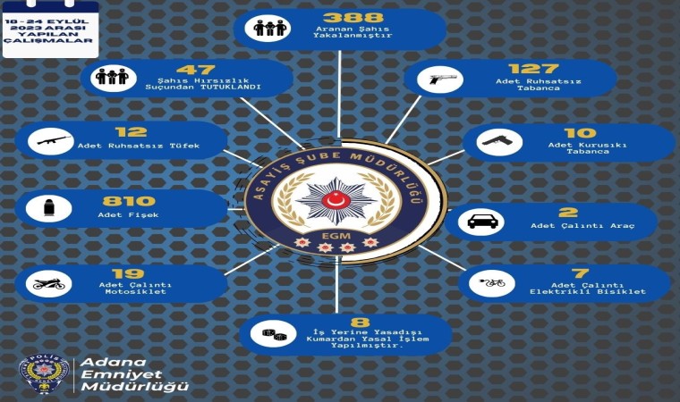 Asayiş Şube Müdürlüğü tarafından vatandaşın can ve mal güvenliği sağlamak amacıyla şehrin bir çok yerinde uygulama yapıldı. Polisin 18 Eylül - 24 Eylül 2023 tarihleri arasında gerçekleştirdiği uygulamada, 388 şahıs yakalanırken, 2 çalıntı araç, 7 çalıntı elektrikli bisiklet, 19 çalıntı motosiklet, 127 ruhsatsız tabanca, 10 kuru sıkı tabanca, 12 ruhsatsız tüfek ve 810 fişek ele geçirilirken, 47 şahıs hırsızlık suçundan tutuklandı. 8 iş yerine yasa dışı kumar suçundan yasal işlem yapıldı.