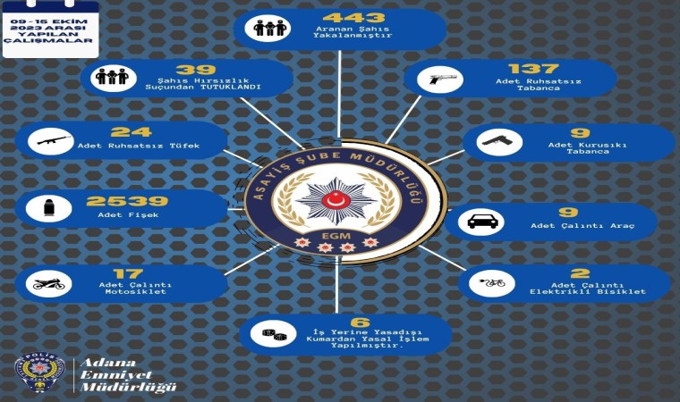 Asayiş Şube Müdürlüğü tarafından vatandaşın can ve mal güvenliği sağlamak amacıyla şehrin bir çok yerinde uygulama yapıldı. Polisin 09 Ekim - 15 Ekim 2023 tarihleri arasında gerçekleştirdiği uygulamada, 443 şahıs yakalanırken, 9 çalıntı araç, 3 çalıntı elektrikli bisiklet, 17 çalıntı motosiklet, 137 ruhsatsız tabanca, 9 kuru sıkı tabanca, 24 ruhsatsız tüfek ve 2539 fişek ele geçirilirken, 39 şahıs hırsızlık suçundan tutuklandı. 6 iş yerine yasa dışı kumar suçundan yasal işlem yapıldı.