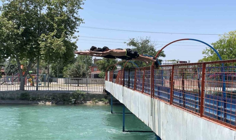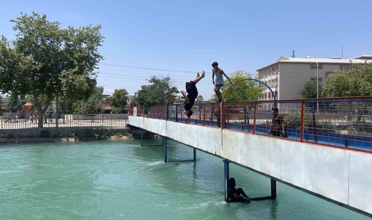 Tüm zamanların en sıcak haziran ayının yaşandığı Adana’da sıcaktan bunalan çocuklar sulama kanallarına akın etti. Nem ile birlikte hissedilen sıcaklığın yaklaşık 50 dereceye ulaştığı kentte, Yüreğir ilçesinde bulunan sulama kanalına giren çocuklar yüzerek serinledi. Yüzme öncesinde kanal üzerindeki köprüden akrobatik hareketler yaparak sulama kanalına atlayan çocukların attığı taklalar ise yürekleri ağızlara getirdi. Kanalda yüzerken boğulmaktan korkmadıklarını ifade eden çocuklar köprüden atlarken adeta uçtuklarını belirterek, "Biz de Adana havayollarıyız" şeklinde konuştu.