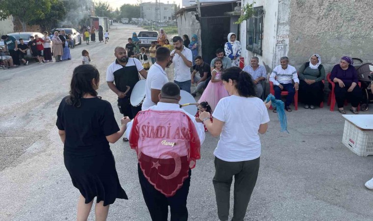 Merkez Yüreğir ilçesine bağlı Koza Mahallesi’nde yaşayan Feride (42) ve Zeki Elçiçek’in (43) 8 çocuğundan en büyüğü olan Ramazan Elçiçek (23), down sendromlu olarak dünyaya geldi. Doğduğundan bu yana sağlık sorunlarıyla boğuşan Ramazan’ın ailesi Adana’da faaliyet gösteren Ogün Abi Derneği’ne ulaştı. Geçmişte dernek öncülüğünde doğum günü kutlaması sürprizi gerçekleştirilen Ramazan’a bu sefer de temsili olarak asker uğurlaması organize edildi. Mahallelinin yoğun ilgi gösterdiği uğurlamada davul çalan Ramazan, annesi ve mahalleli ile karşılıklı oynadı, asker selamı verdi.