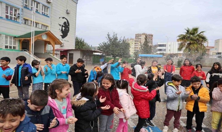 Kozan’da ise kara hasret kalan öğrenciler için Halit Dağlı İlköğretim Okulu’na suni kar getirildi. Öğrenciler üzerlerine sıkılan suni karla doyasıya eğlendi.