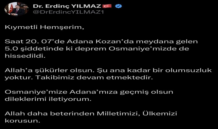 Osmaniye Valisi Erdinç Yılmaz yaptığı açıklamada, “Saat 20.07’de Adana Kozan’da meydana gelen 5.0 şiddetindeki deprem Osmaniye’mizde de hissedildi. Allah’a şükürler olsun şu ana kadar bir olumsuzluk yoktur. Takibimiz devam etmektedir. Osmaniye’mize, Adana’mıza geçmiş olsun dileklerimi iletiyorum” dedi.