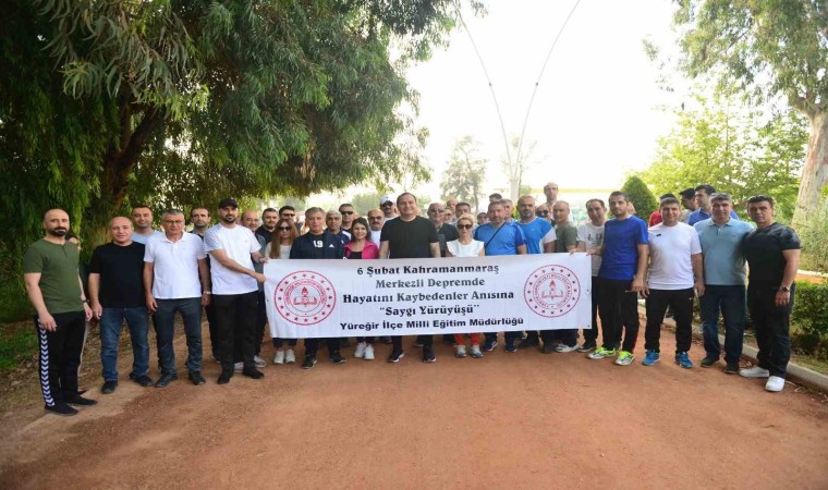 Adana'da, Kahramanmaraş merkezli depremde kaybedilen vatandaşların anısına öğretmenler tarafından bir 'saygı yürüyüşü' gerçekleştirildi. Etkinliğe Adana İl Milli Eğitim Müdürü Yaşar Koçak ve İlçe Milli Eğitim Müdürü Murat Çelik de katıldı. Öğretmenlerin, depremde hayatını kaybeden vatandaşları anma amacıyla bir araya geldiği bu 'saygı yürüyüşü,' Yaşar Kemal Yürüyüş Parkuru'nda düzenlendi. Şube müdürleri ve okul müdürlerinin de katıldığı yürüyüş, birlik ve dayanışma içinde gerçekleştirildi.
