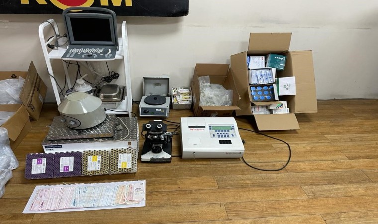 Baskın yapılan binada, İl Sağlık Müdürlüğü ekipleriyle gerçekleştirilen aramada, 90 serum ile 300 iğne, anestezik ve bulantı önleyici 339 kutu ilaç, 259 enjektör, ultrason, mikroskop, şeker ölçüm gibi işlemler için kullanılan 8 tıbbi cihaz, 56 Kovid-19 ve gebelik testi, 390 kan tüpü, 21 bin 645 lira ve çeşitli tıbbı malzemeler ele geçirildi.