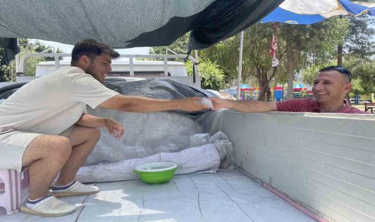 Adana’da vatandaşlar nem ile birlikte 50 derece hissedilen bunaltıcı sıcaklarda Toros Dağları’ndan getirilen kar ile serinliyor.