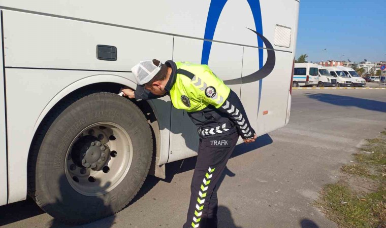 Yolcu otobüslerinde kış lastiklerinin bulunup bulunmadığını denetleyen ekipler, takılı lastiklerin de diş derinliklerini kontrol etti.
