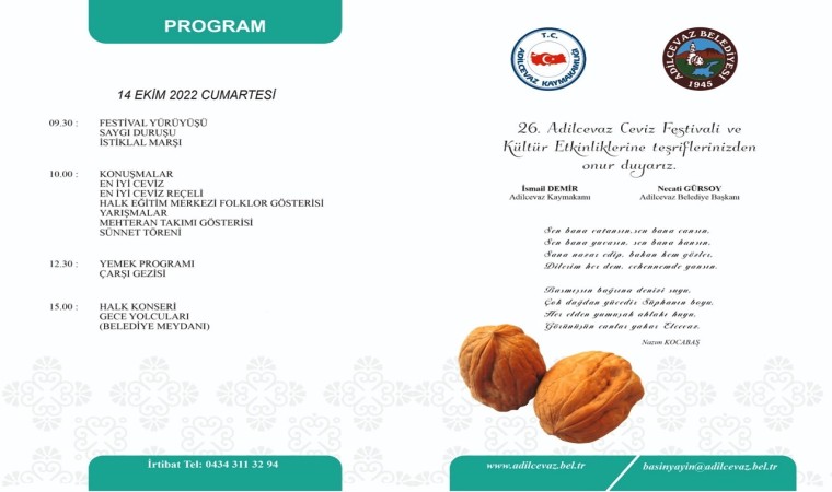 Adilcevaz Belediye Meydanı’nda 14 Ekim 2023 Cumartesi günü düzenlenecek olan etkinlikte, sabah 09.30’da başlayacak olan festival yürüyüşü ve resmi açılış programının yanı sıra en iyi ceviz ve en iyi ceviz reçeli yarışmalarında dereceye girenlere ödülleri verilecek. Halk Eğitimi Merkezi Müdürlüğü folklor ekibi ve mehteran takımı gösterilerinin ardından toplu sünnet şöleni ve gezen sinema etkinlikleri düzenlenecek.