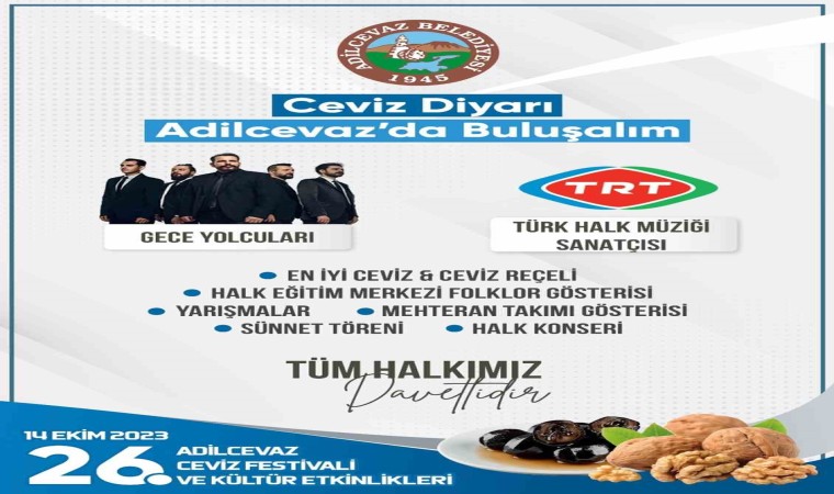 Bitlis’in Adilcevaz ilçesinde belediye ve kaymakamlığın organizesiyle “26. Adilcevaz Ceviz Festivali ve Kültür Etkinlikleri” düzenlenecek.