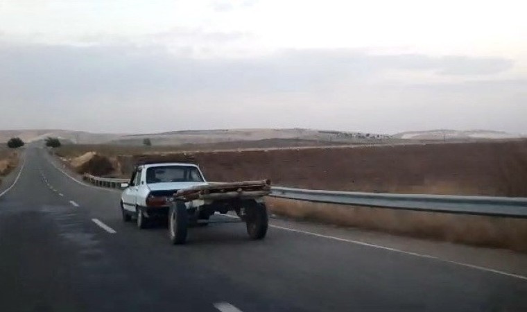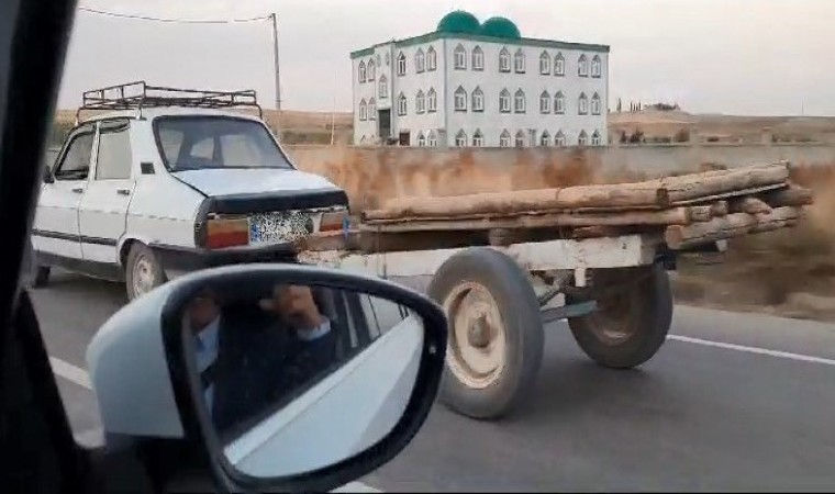 Adıyaman’ın Samsat ilçesinde bir vatandaş yük taşımak için otomobilinin arkasına at arabası bağladı. Samsat-Adıyaman karayolu Uzuntepe ile Taşkuyu arasındaki güzergahta görüntülenen otomobil, seyir halindeki sürücülerin dikkatinden kaçmadı. O anları ise başka bir sürücü görüntüledi.