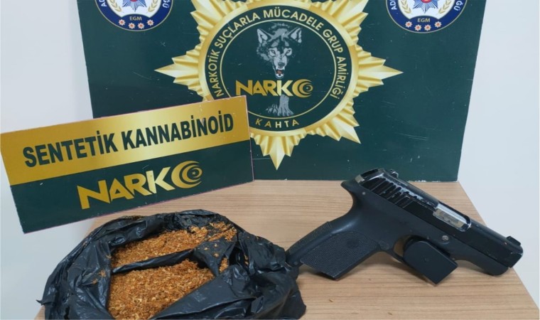Adıyaman İl Emniyet Müdürlüğü Narkotik Şube Müdürlüğü’ne bağlı Kahta Narkotik Suçlarla Mücadele Büro Amirliği ekipleri tarafından son bir hafta içerisinde çok sayıda uygulama yaptı. Kahta Cumhuriyet Başsavcılığı koordinesinde yapılan çalışmalar neticesinde 304,61 gram esrar, 8 adet excaty hap, 100,53 gram sentetik kannabinoid ve 1 adet ruhsatsız tabanca ele geçirildi.