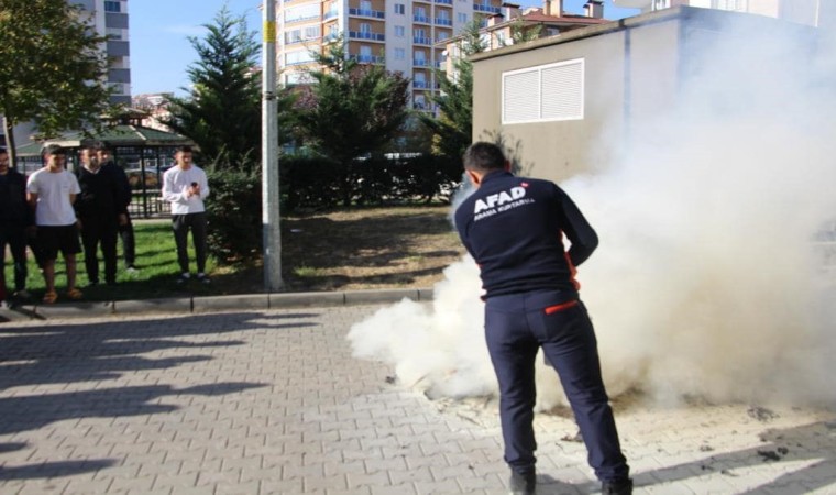 Çankırı’da AFAD tarafından erkek öğrenci yurdunda düzenlenen tatbikatta öğrenciler yangınlara müdahaleyi uygulamalı olarak öğrendi.