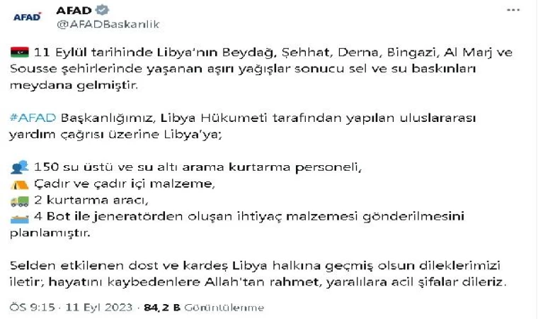 11 Eylül'de Beydağ, Şehhat, Derna, Bingazi, Al Marj ve Sousse gibi Libya şehirlerinde meydana gelen aşırı yağışlar sonucu sel ve su baskınları, Libya Hükümeti tarafından uluslararası yardım çağrısı yapılmasına yol açtı. AFAD, bu yardım çağrısına yanıt vererek Libya'ya yardım gönderme kararı aldığını açıkladı.