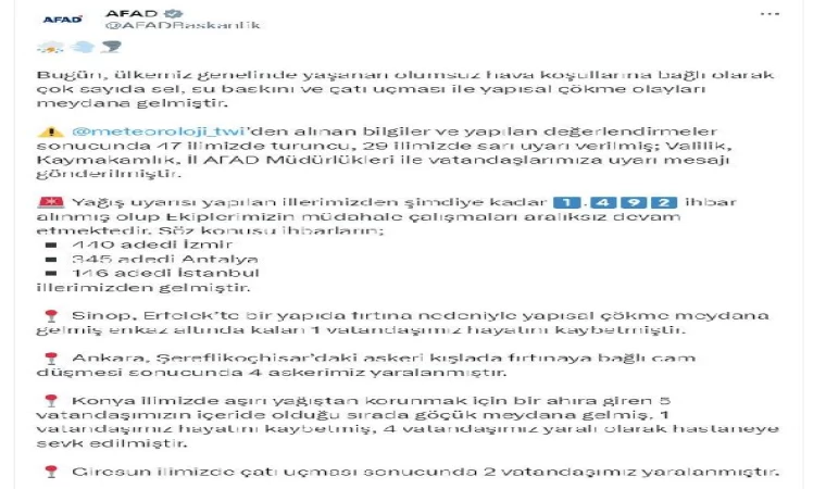 AFAD'ın sosyal medya hesabından yapılan açıklamada, bugün yurt genelinde yaşanan olumsuz hava koşullarına bağlı olarak çok sayıda sel, su baskını ve çatı uçması ile yapısal çökme olaylarının meydana geldiği belirtilerek, Meteoroloji Genel Müdürlüğü'nden alınan bilgiler ve yapılan değerlendirmeler sonucunda 47 ilde turuncu, 29 ilde ise sarı uyarı verildiği hatırlatıldı. Ayrıca valilik, kaymakamlık ve il AFAD müdürlükleri ile vatandaşlara gerekli uyarı mesajlarının gönderildiği kaydedildi.