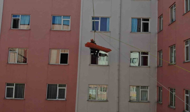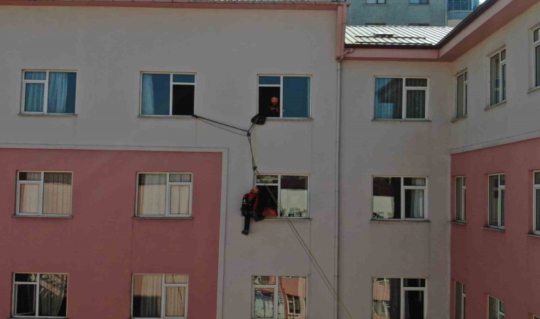 Trabzon’da İl Afet ve Acil Durum Müdürlüğü (AFAD) öncülüğünde 1-7 Mart Deprem Haftası nedeniyle bir okulda deprem tatbikatı gerçekleştirildi. Tatbikatta, bir öğrenci senaryo gereği mahsur kaldığı okul binasının en üst katından halatlar yardımıyla kurtarıldı.