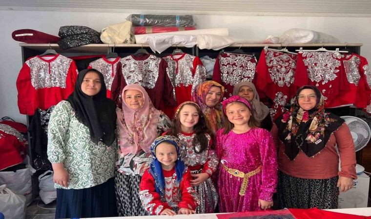 Afyonkarahisar’ın Sinanpaşa ilçesine bağlı Tınaztepe beldesinde ev hanımı Esma Söğüt tarafından kurulan pullu sıkma atölyesinde yaklaşık 15 kadın yöresel kıyafet dikerek aile ekonomisine katkı sağlıyor.