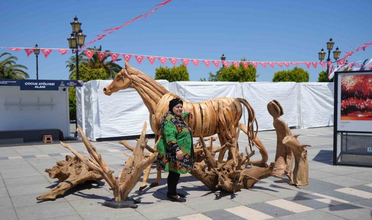 İnsanların eserlerine oldukça fazla ilgi gösterdiğini de ifade eden Korkmaz, “Ağaca şekil vermek, farklı bir çalışma gerektiriyor. Yapacağım sanat eserlerinde benzeteceğim hayvanların malzemelerini doğadan topluyorum. Ağaçlara çok müdahale etmek istemiyorum. Örneğin doğada atın kuyruğuna ya da ayağına benzer bir parça bulursam alıyorum. Samsunluyum. Festival başladığından beri de Kurtuluş Yolu Sergi Alanındayım. Hakikaten insanların yaptığım eserlere ciddi anlamda ilgisi var” diye konuştu.