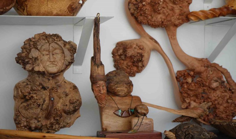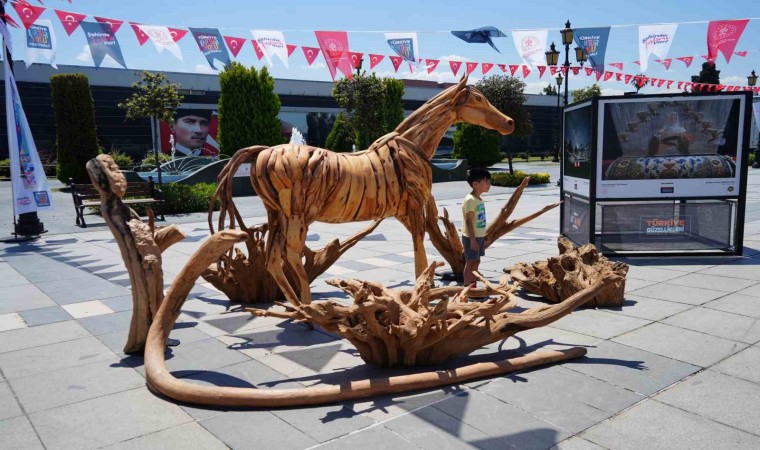 Çocuk yaştan beri ahşap ürünlerle uğraşan ahşap ustasının ağaç kökleri ve parçalarını kullanarak yaptığı gerçek boyutlardaki ‘ağaç at’ görenlerin dikkatini çekiyor.