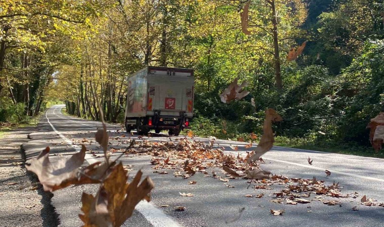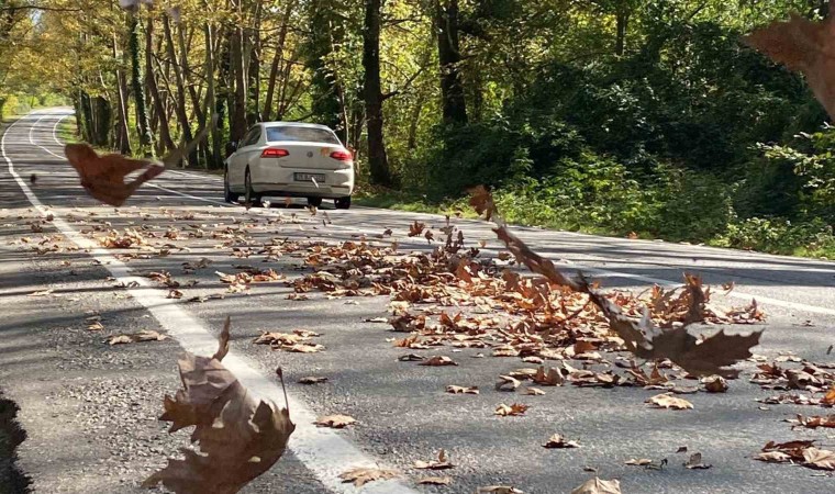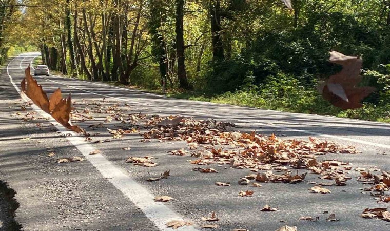 Geçen araçlarla yoldaki kuru yapraklar uçuşuyor