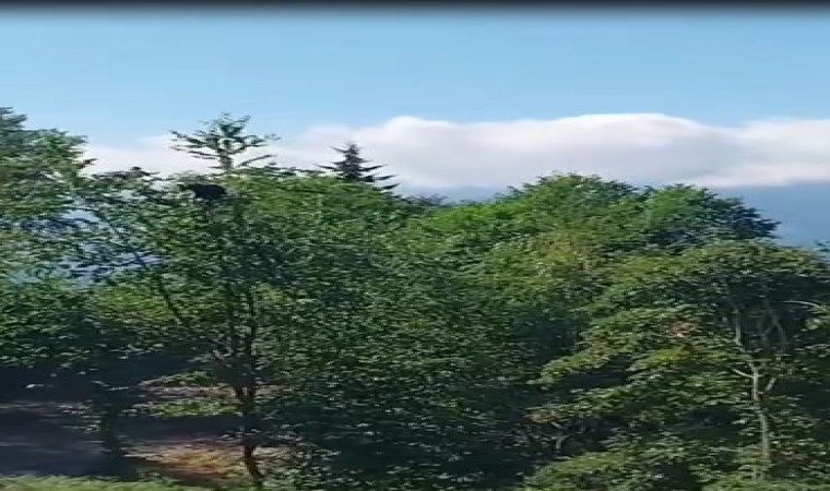 Ayının ağacın tepesine kadar çıktığını gören vatandaş, düşmesinden korkarak, "Ula in aşağı" diyerek seslendi. Görüntüler, sosyal medyada paylaşılarak büyük ilgi gördü.