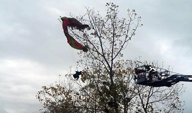 Ağaca takılan yamaç paraşütçüsünü itfaiye kurtardı