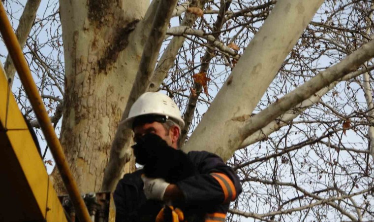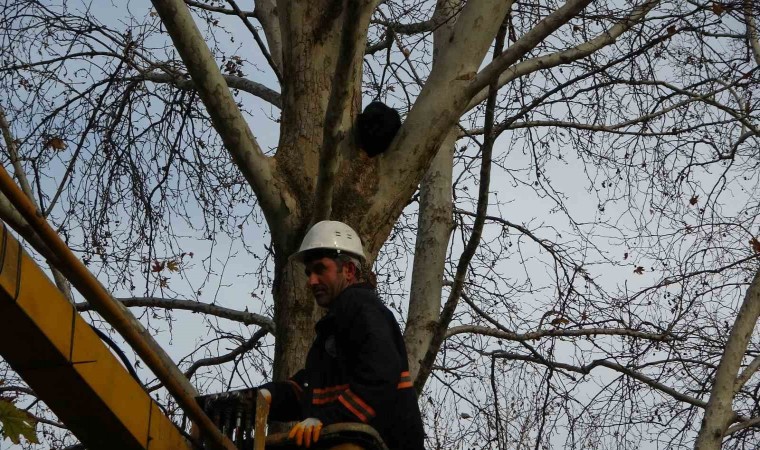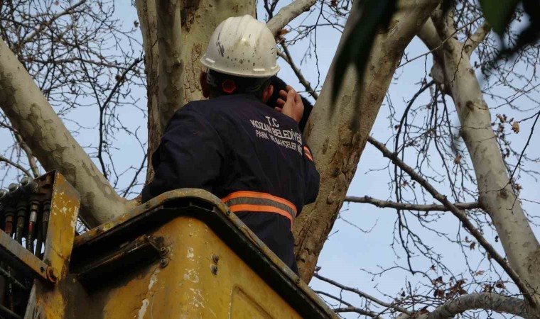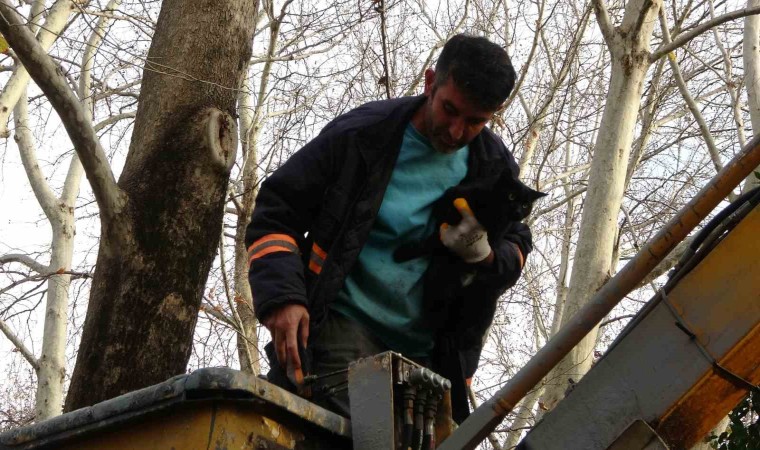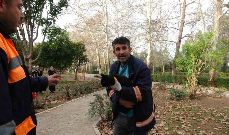 Adana’nın Kozan ilçesinde bir çınar ağacında 3 gündür mahsur kalan kedi, park bahçe ekiplerinin fark etmesi üzerine kurtarıldı.