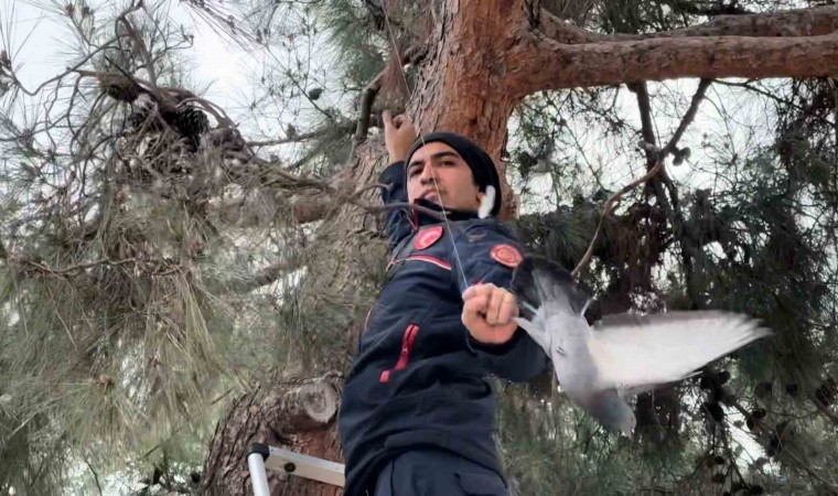 Olayı anlatan Kemal çakal, "Baktım ip kuşun ayağına dolanmış. İtfaiyeyi aradım. Onlar da ’tamam ama şuanda olay var, olaydan sonra oraya aktarıyorum’ dediler. İtfaiye gelip güvercini kurtardı" dedi.