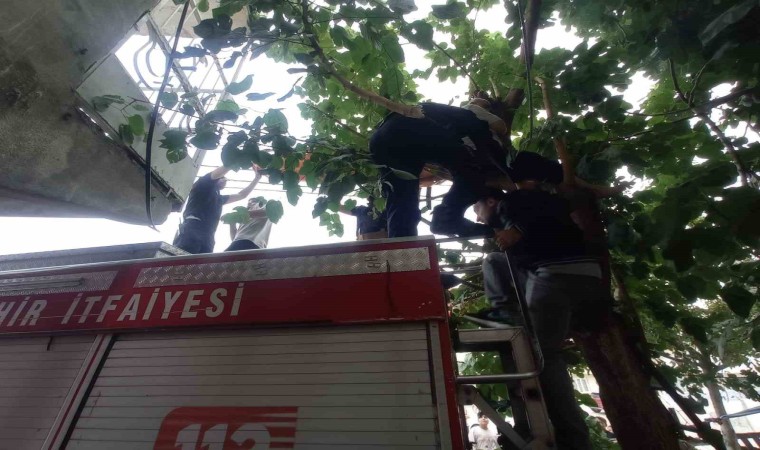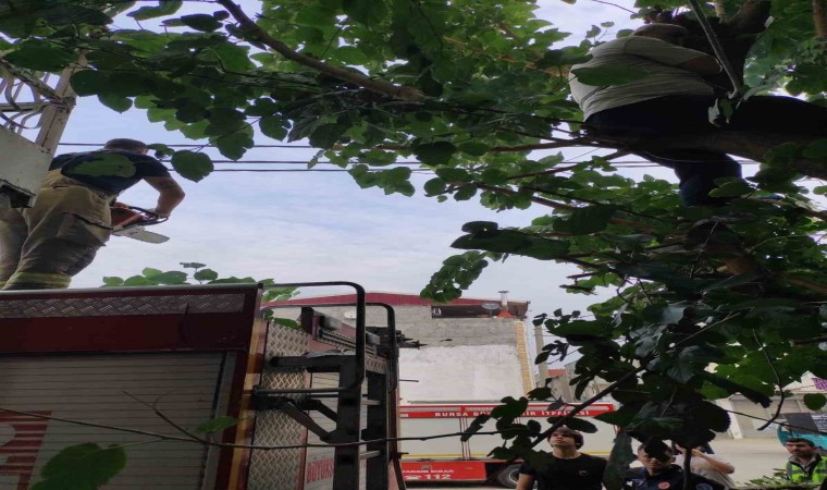 Bursa’da ağaçta mahsur kalan kediyi indirmek isterken kendisi de mahsur kalan yaşlı adamı itfaiye kurtardı.