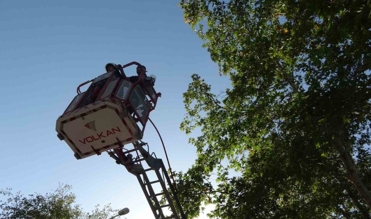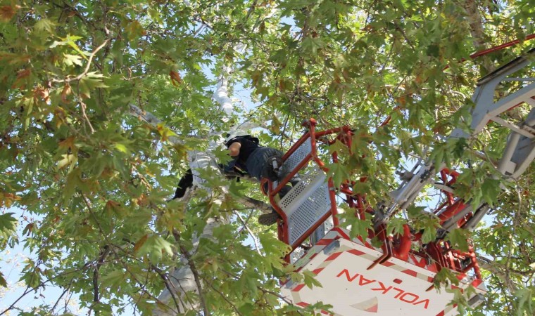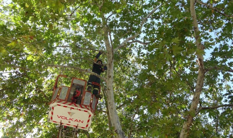 Kozan ilçesinde bir ağaçta 8 saat boyunca mahsur kaldığı ihbar edilen kedi, kendini kurtarmak isteyen itfaiye erine gitmek yerine aşağı atlayınca yürekleri ağızlara getirdi.