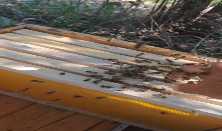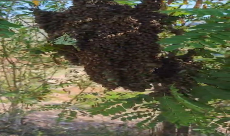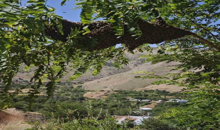 Elazığ’ın Palu ilçesi Güllüce köyünde koloni halinde havada uçan bal arıları, ağaca konarak oğul verdi. Ağaç dalına konan arıların uzunluğu yaklaşık 1 metreye ulaşırken, Murat Karakaya ise oğul veren arıları elleri ile toplayarak kovana bıraktı.