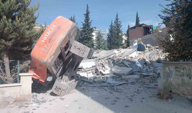 Gaziantep’te depremde ağır hasar alan bir bina, kontrollü yıkım sırasında kepçenin üzerine çöktü. Yaşanan paniğin cep telefonu kamerasına yansıdığı olayda kepçe enkaz altında kalırken, operatör ise son anda canını kurtardı.