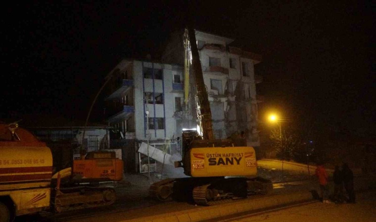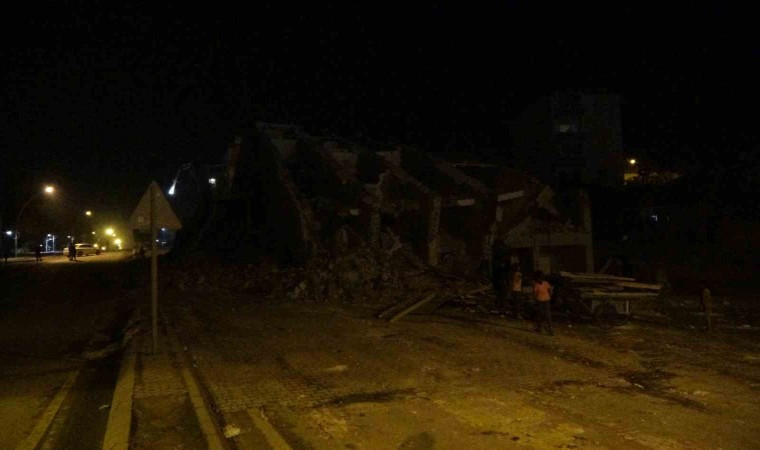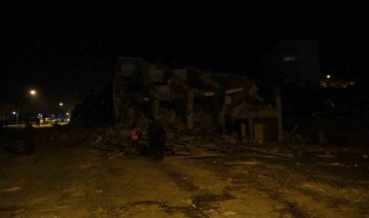 Malatya’da ağır hasarlı bir bina, yıkım işlemleri sırasında yola devrildi.