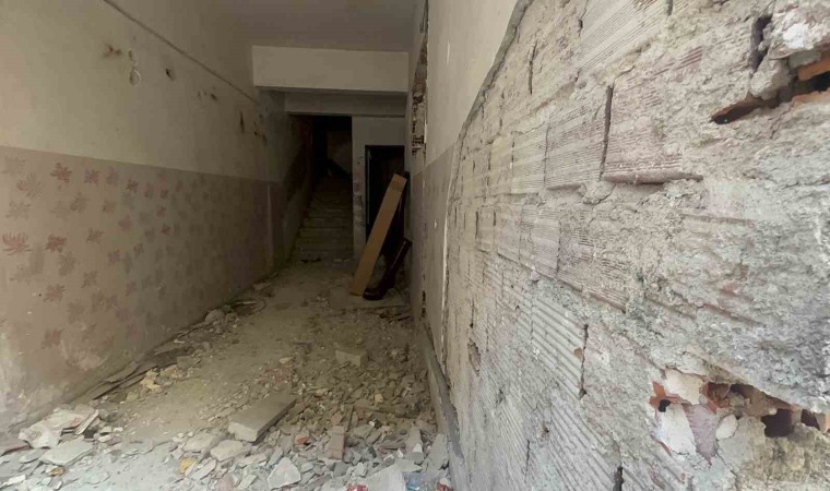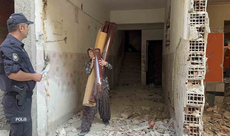 Yaşlı kadın, ekiplerin bilgilendirmesi ve ikna etmesi sonrası ağır hasarlı binadan soba borularını alarak bölgeden uzaklaştırıldı.