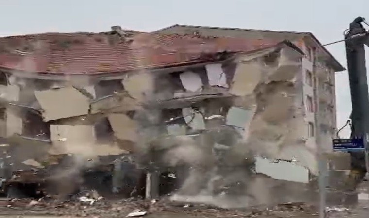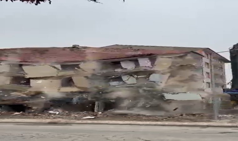 Kahramanmaraş’ta meydana gelen yıkıcı depremlerden etkilenen iller arasından bulunan Elazığ’da ağır hasarlı binaların yıkımı da sürüyor. Bu çerçevede, merkeze bağlı Doğukent Mahallesi’nde yıkımına başlanan 4 katlı bina, iş makinesinin makasını vurmasıyla bir anda yerle bir oldu. Ortalık toz bulutu ile kaplanırken, o anlar cep telefonu kamerasına saniye saniye yansıdı.