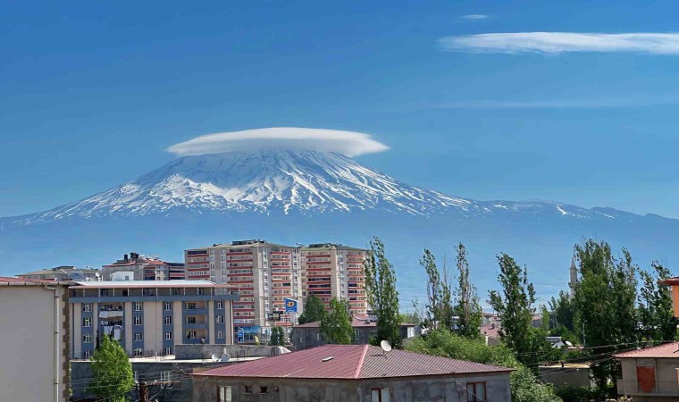 İran, Nahçıvan ve Ermenistan sınırında yer alan ve üç ülkeden de görülebilen 5 bin 137 metre yüksekliğindeki Ağrı Dağı’nın zirvesini, halk arasında "şapka" olarak bilinen mercek bulutu sardı. Karla kaplı dağın zirvesini tamamen saran ve şapka şeklini andıran bulut, görenleri hayran bıraktı. Her yıl binlerce yerli ve yabancı turistin ziyaret ettiği Ağrı Dağı, bu eşsiz manzara ile bir kez daha kartpostallık görüntüler sundu.