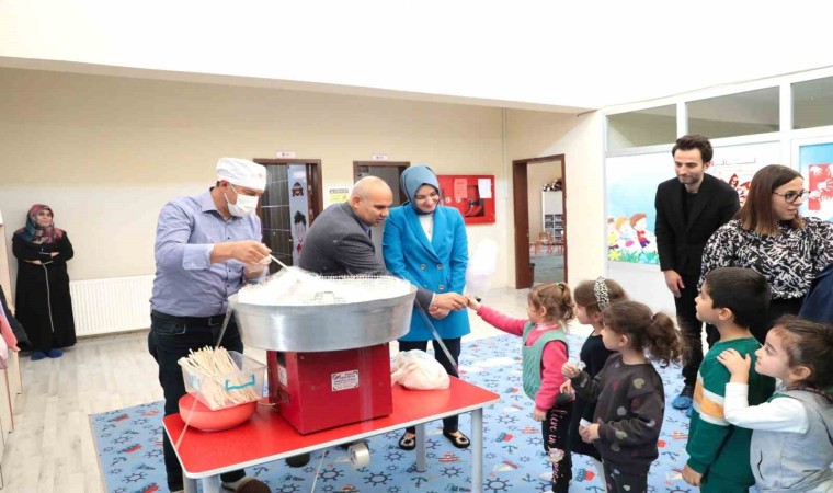 Ağrı Valisi Mustafa Koç ve eşi Neslihan Gül Koç, Sevimli Anaokulunu ziyaret ederek minik öğrencilere masallar okuyup onlara pamuk şeker ikram etti.