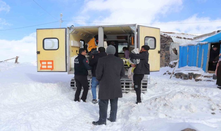 Ağrı’nın Hamur ilçesine bağlı uzak bir köy olan Yuvacık köyüne ailenin biri 9 aylık olmak üzere 4 çocuğu rahatsızlandı. Yolun kar ve tipi nedeniyle ulaşıma kapalı olmasından dolayı hastaneye gidemeyen aile durumu 112 Acil Çağrı Merkezine bildirdi. İhbar üzerine hemen harekete geçen sağlık ekipleri, paletli ambulansla yola çıktı. 6 saatlik çalışmanın ardından köye ulaşan ekipler, Miran (9), Barış (6), Helin (3) ve 9 aylık bebek Mert Ali bebeği kendilerini bekleyen normal ambulansa aldı.