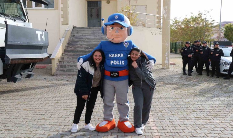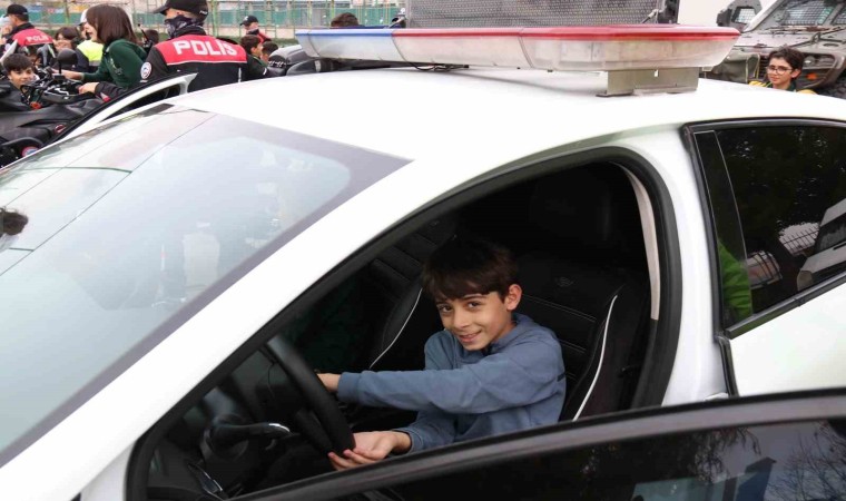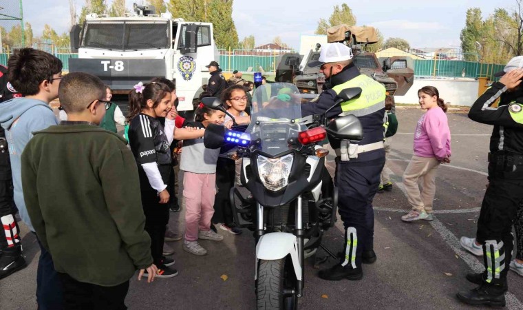 Özel bir okulda gerçekleştirilen etkinlikte, öğrenciler Toplumsal Olaylara Müdahale Aracı (TOMA), akrep, motosiklet ve trafik araçlarını inceledi, polislerle sohbet etti.