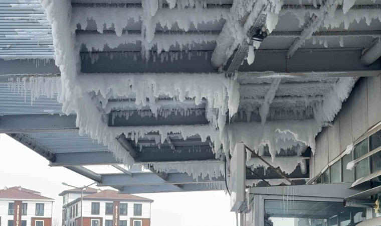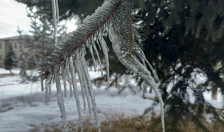Ağrı’da dondurucu hava nedeniyle kent merkezinde ağaçlar ve bitkiler kırağı tutarken, evlerin çatılarında metrelerce buz sarkıtları oluştu.