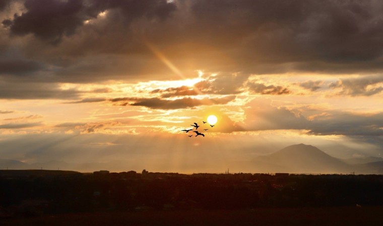 Ağrı merkez Küpkıran Mahallesi’nde bulunan Küpkıran Tepesi’nde, gün batımıyla birlikte kızıla bürünen gökyüzünde kartpostallık görüntüler oluştu. Bulutların arasından yansıyan güneş ışınları görsel bir şölen oluştururken, buğday başaklarının arasından süzülen güneş ışıkları görenleri etkiledi. Eşsiz manzarasıyla kendine hayran bırakan gün batımını izleyenler ise fotoğraf çekerek güzel anları ölümsüzleştirdi.