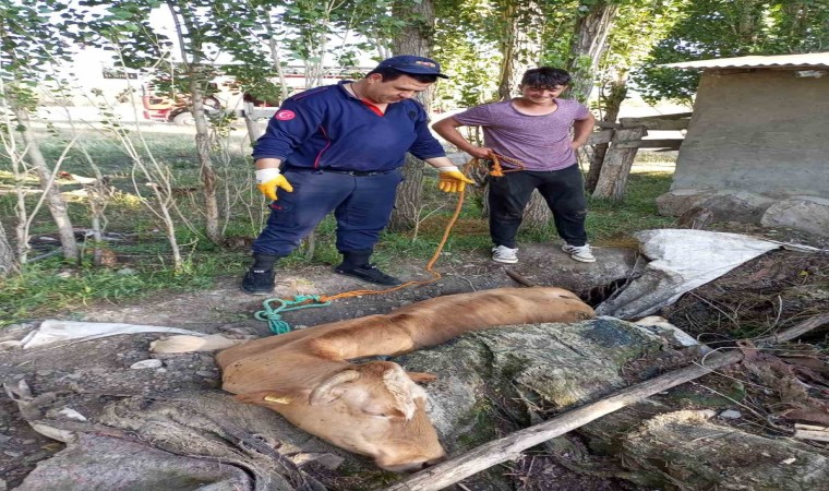 Ağrı il merkezinde bir vatandaşın evinin yanında bulunan çukura düşen inek, itfaiyenin yangın merdiveni sayesinde kurtarıldı.