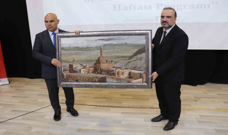 Konferans sonrası Vali Mustafa Koç, Diyanet İşleri Başkanlığı Müşaviri Doç. Dr. Fatih Kurt’a İshak Paşa Sarayı tablosu hediye etti.